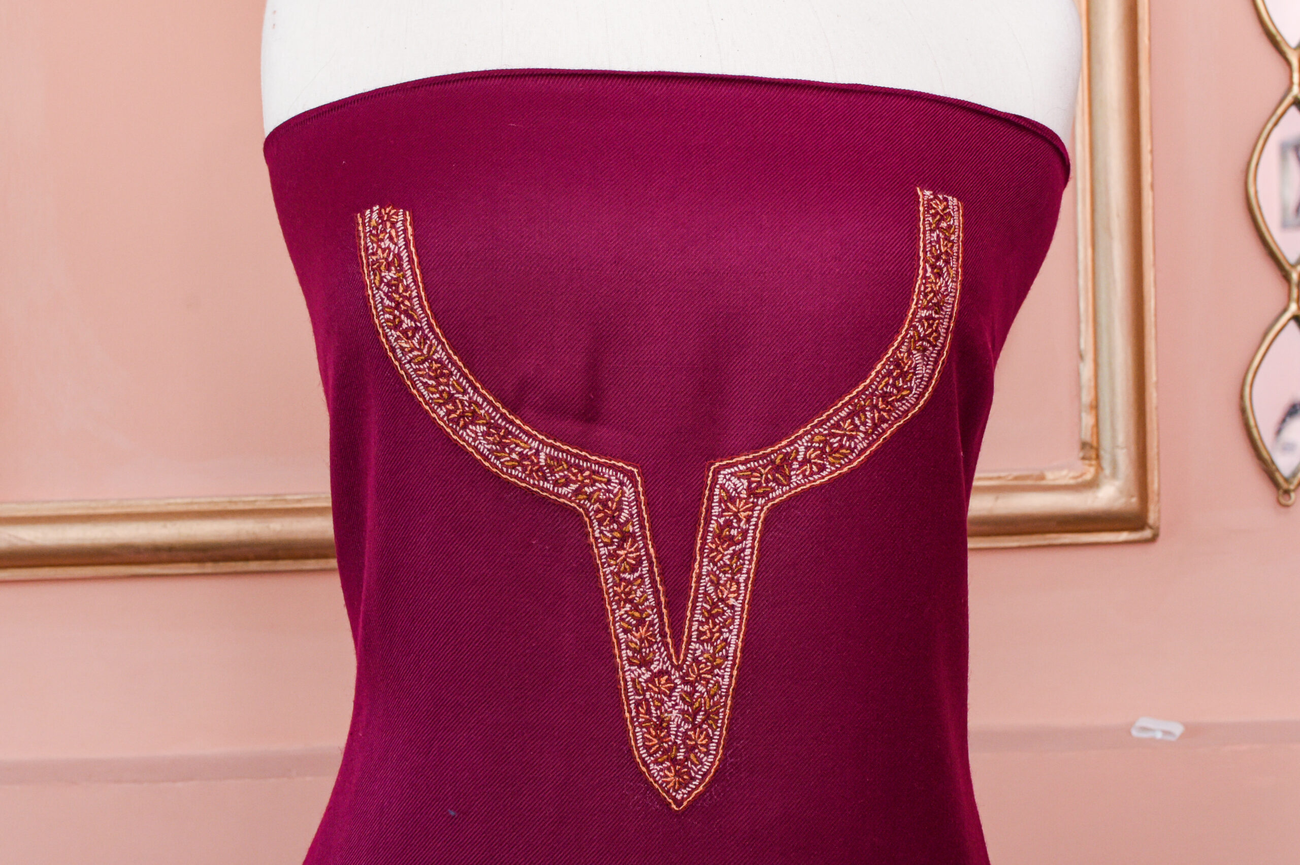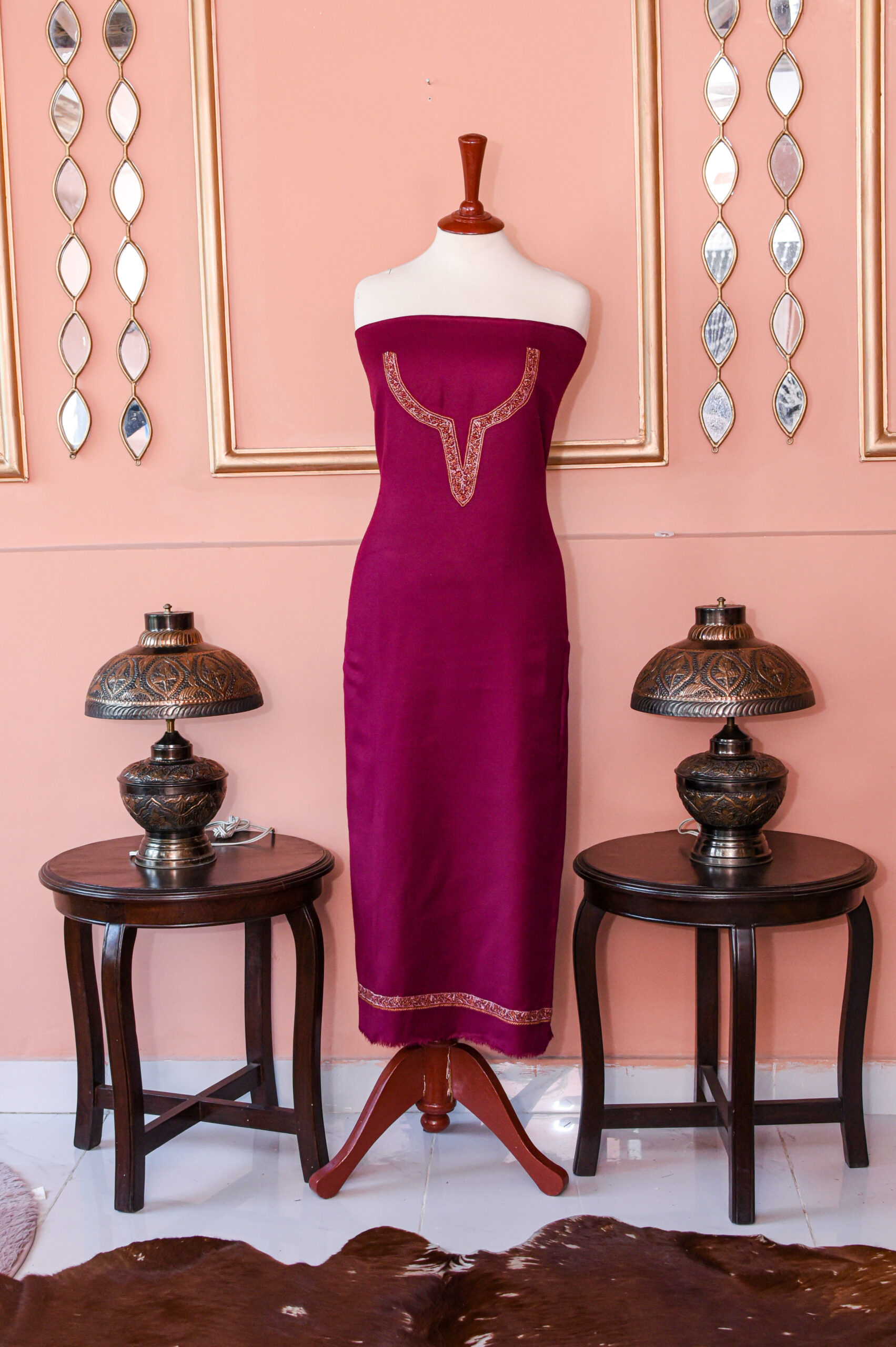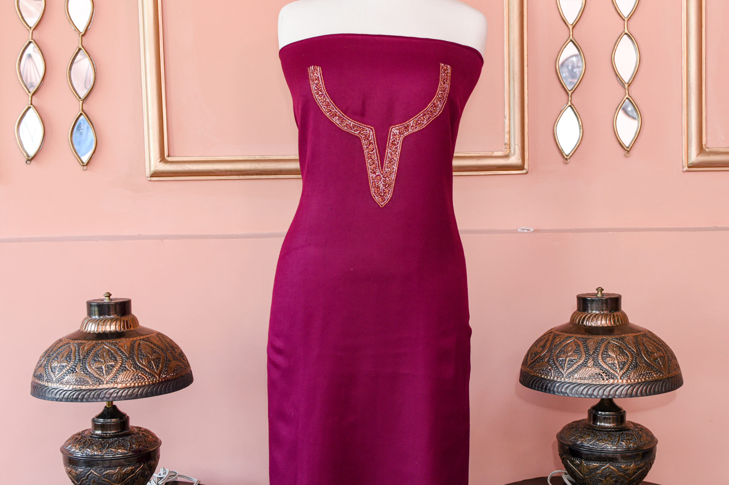 Elevate your wardrobe with this exquisite Kashmiri hand-embroidered dress fabric, crafted in a rich, deep maroon hue that exudes timeless sophistication. The luxurious fabric drapes beautifully, offering a smooth, graceful fall perfect for tailored suits, kurtas, or traditional ensembles. Perfect for festive occasions, cultural gatherings, or elegant evening wear, this handcrafted dress fabric blends tradition, elegance, and luxury in every detail.
