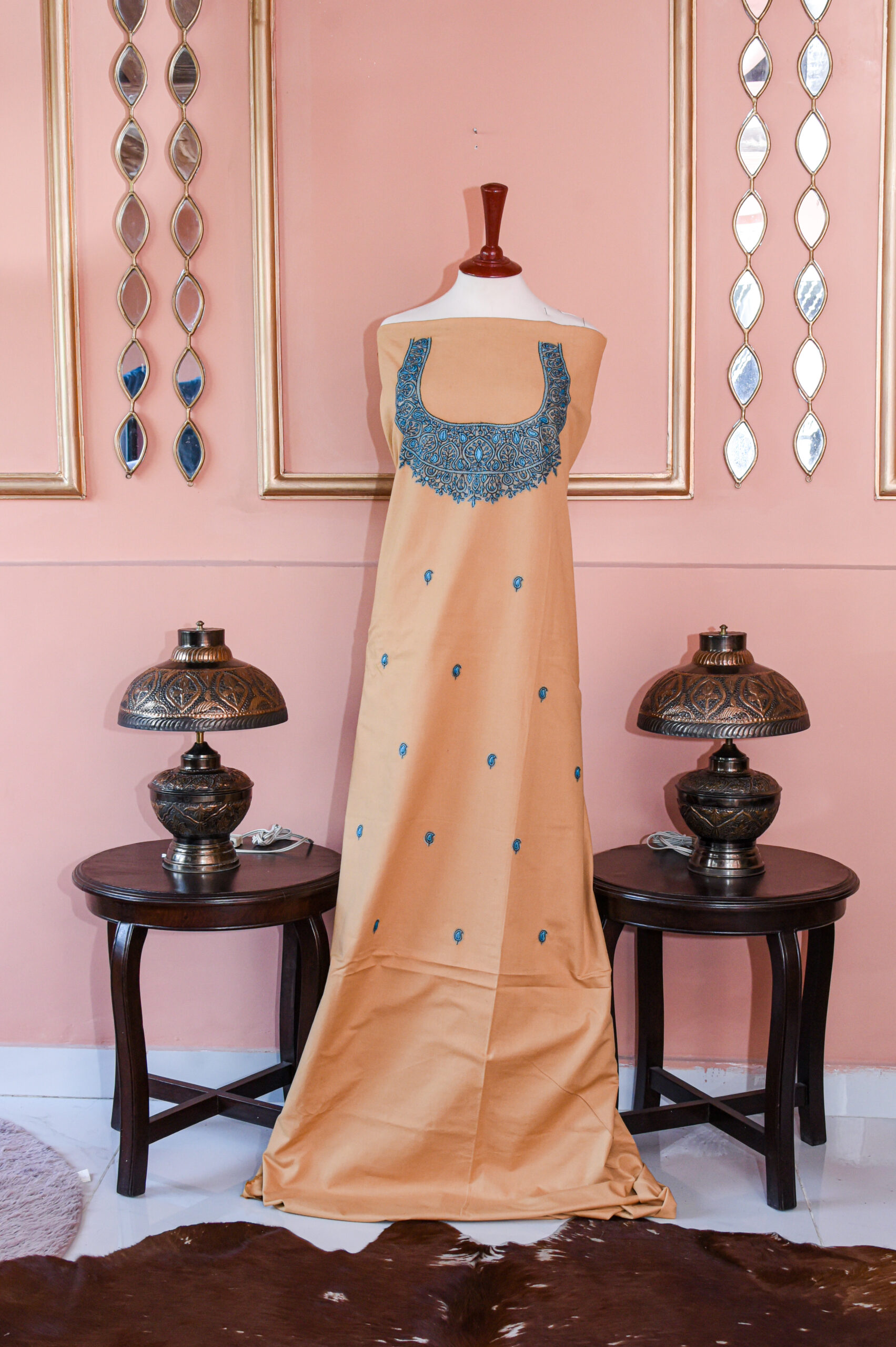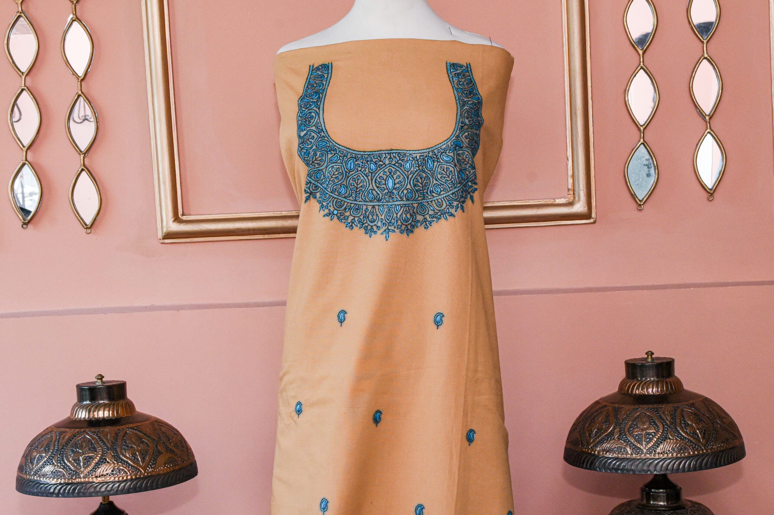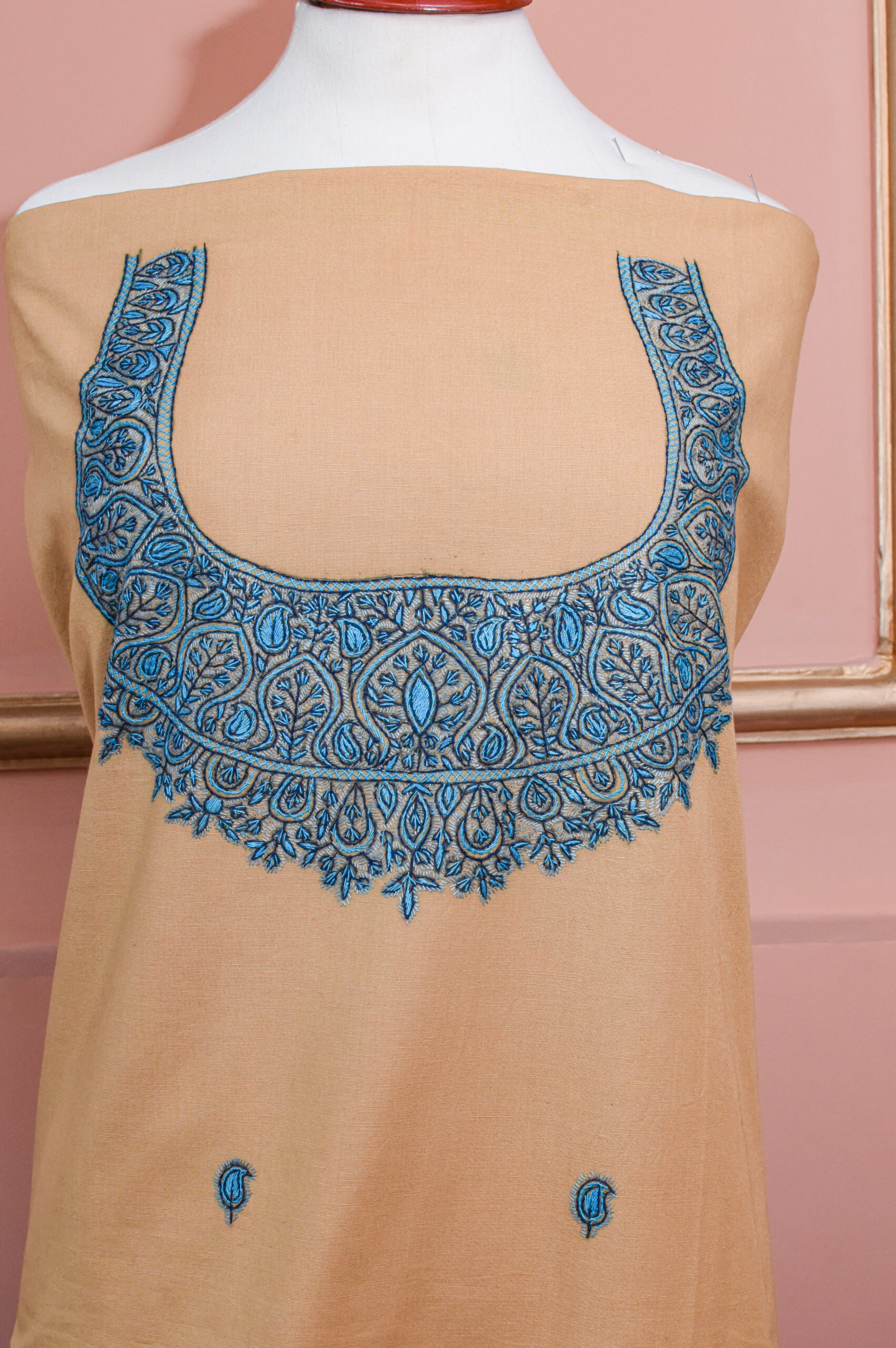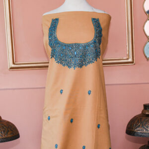 Elevate your wardrobe with this exquisite Kashmiri hand-embroidered dress fabric, crafted in a rich, deep teal hue that exudes timeless sophistication. The luxurious fabric drapes beautifully, offering a smooth, graceful fall perfect for tailored suits, kurtas, or traditional ensembles. Perfect for festive occasions, cultural gatherings, or elegant evening wear, this handcrafted dress fabric blends tradition, elegance, and luxury in every detail.