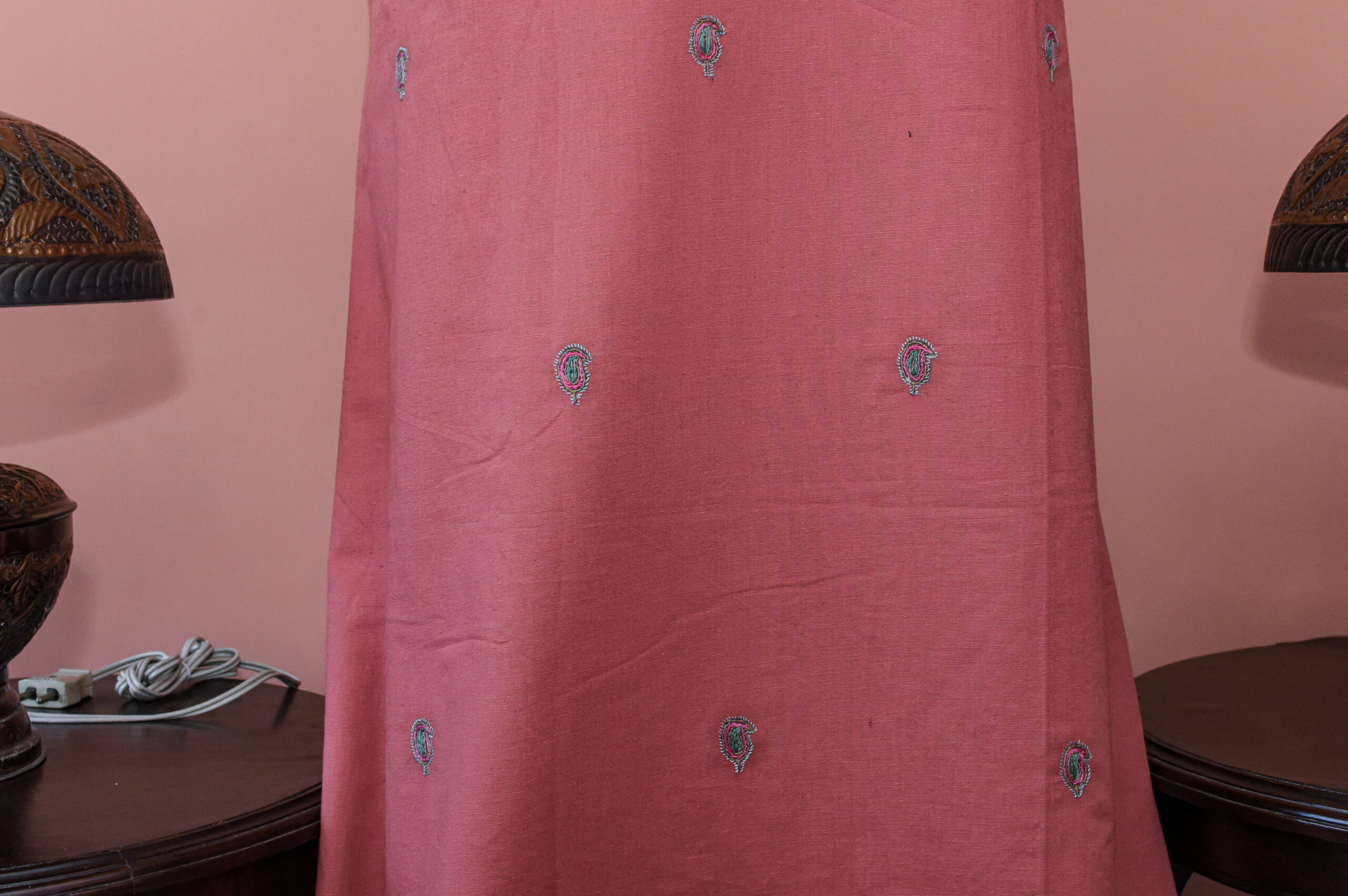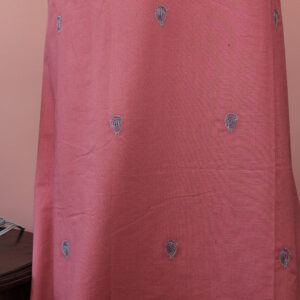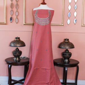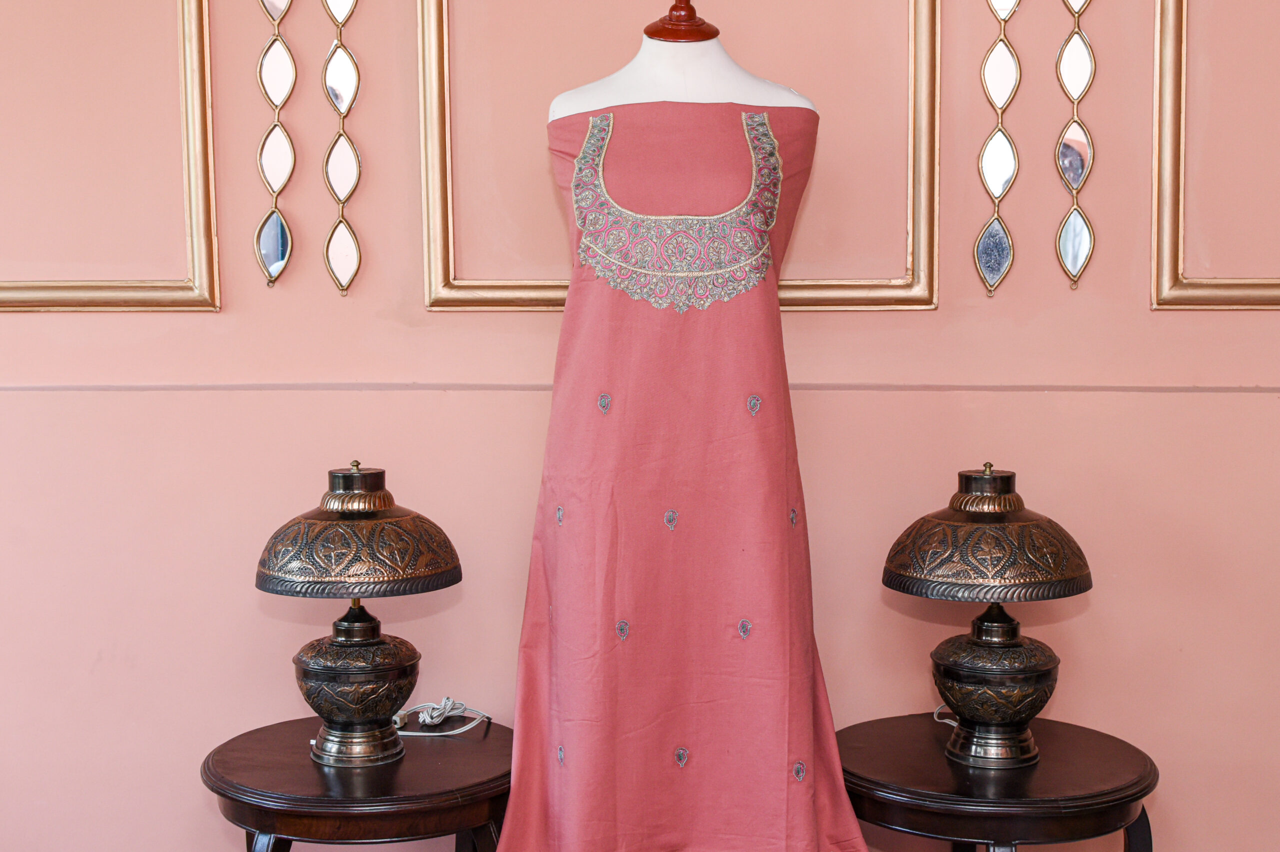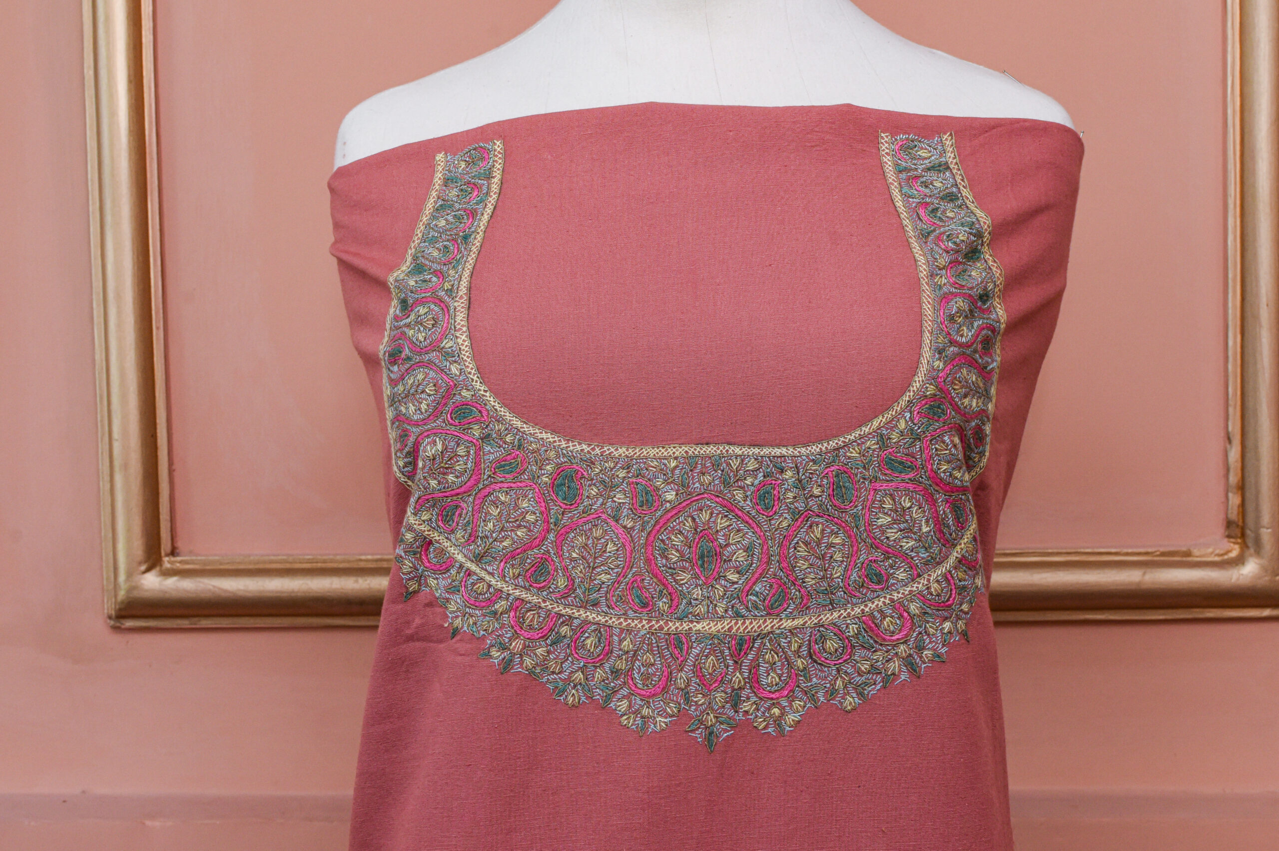 At the heart of this piece is its stunning Kashmiri Aari embroidery, meticulously worked by skilled artisans. The intricate neckline pattern features delicate threadwork in gold-toned accents, creating a refined contrast against the bold maroon base. Each stitch reflects generations of craftsmanship, making this fabric not just attire—but an heirloom of artistry.