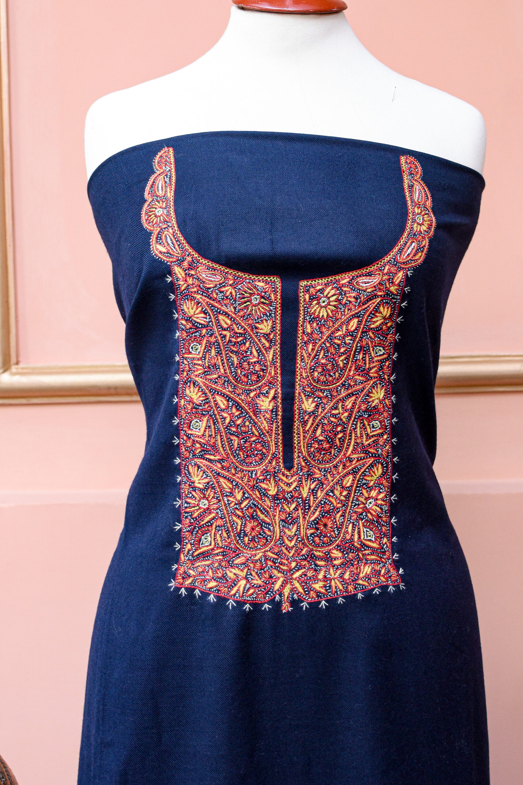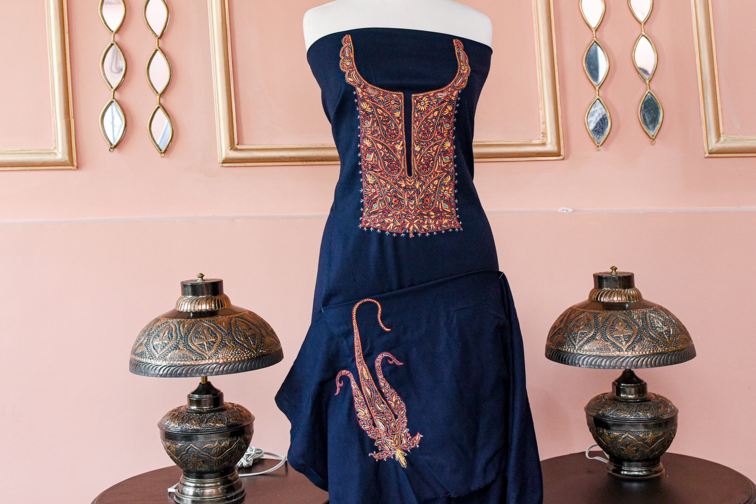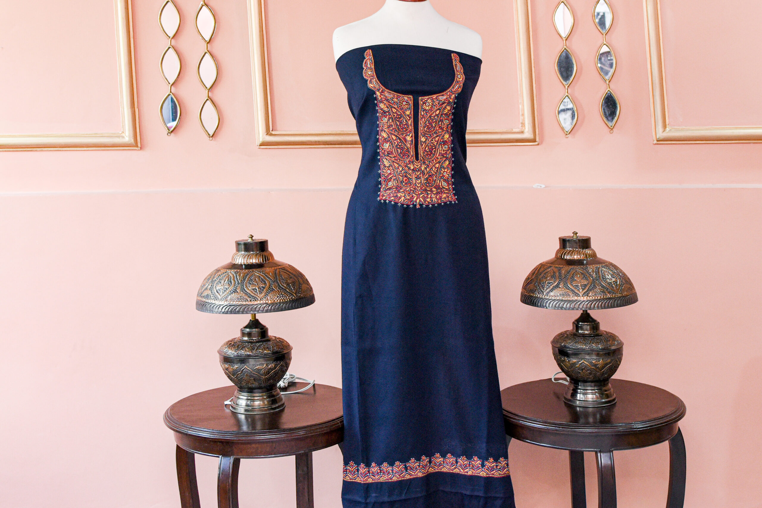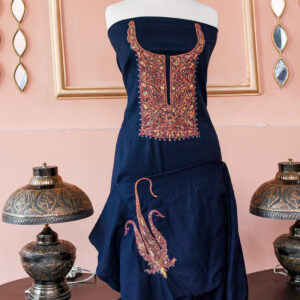 At the heart of this piece is its stunning Kashmiri Aari embroidery, meticulously worked by skilled artisans. The intricate neckline pattern features delicate threadwork in gold-toned accents, creating a refined contrast against the bold maroon base. Each stitch reflects generations of craftsmanship, making this fabric not just attire—but an heirloom of artistry.