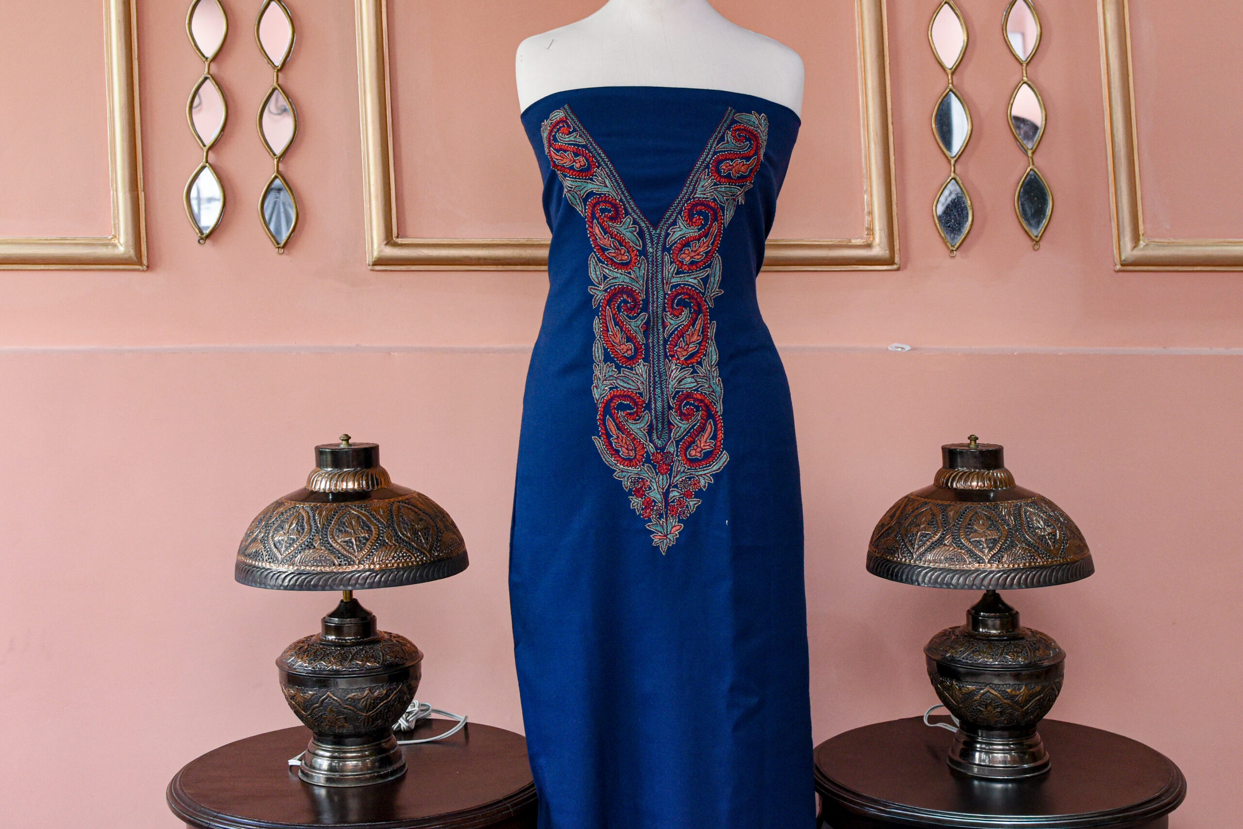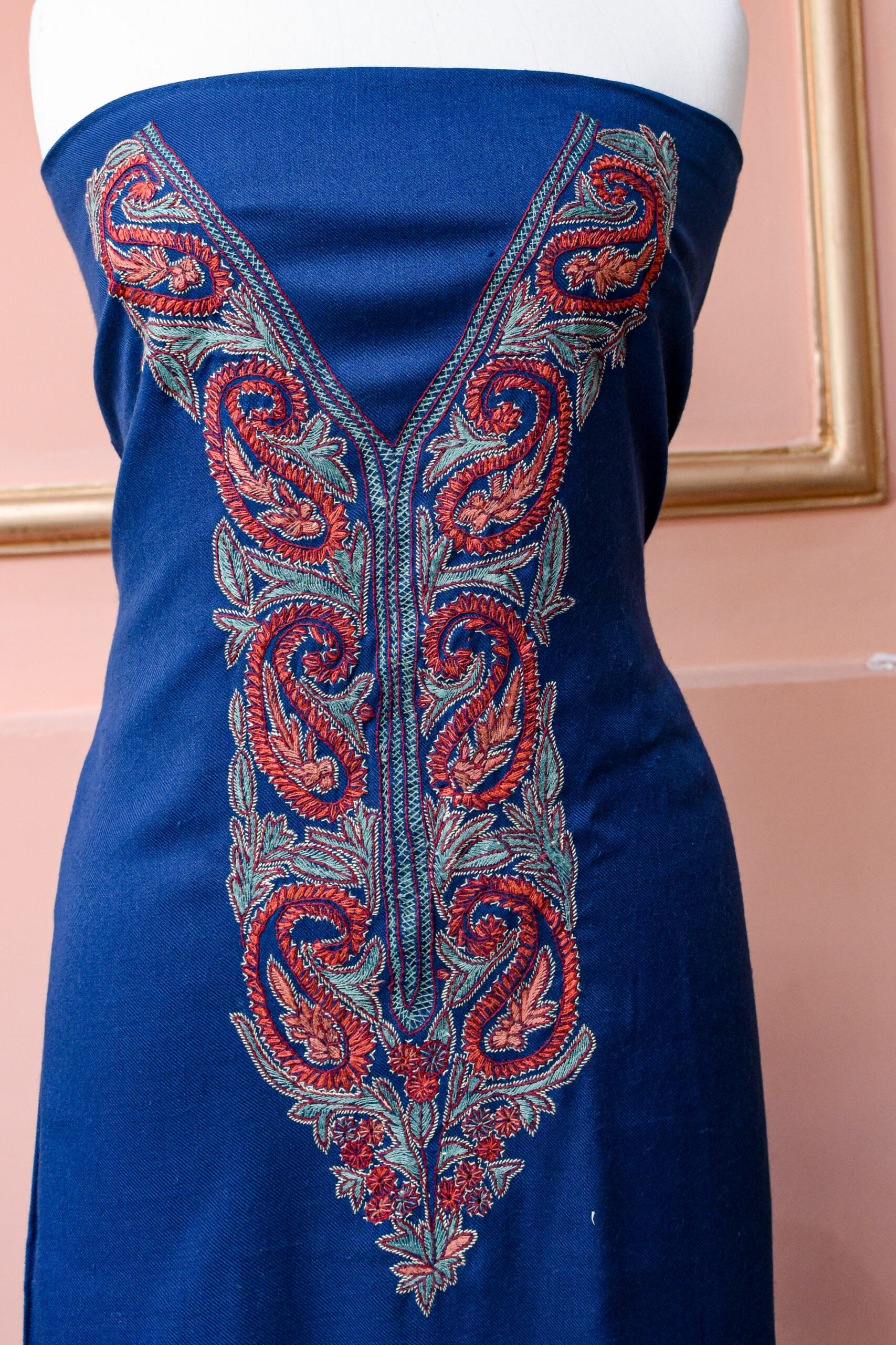 At the heart of this piece is its stunning Kashmiri Aari embroidery, meticulously worked by skilled artisans. The intricate neckline pattern features delicate threadwork in gold-toned accents, creating a refined contrast against the bold maroon base. Each stitch reflects generations of craftsmanship, making this fabric not just attire—but an heirloom of artistry.