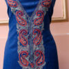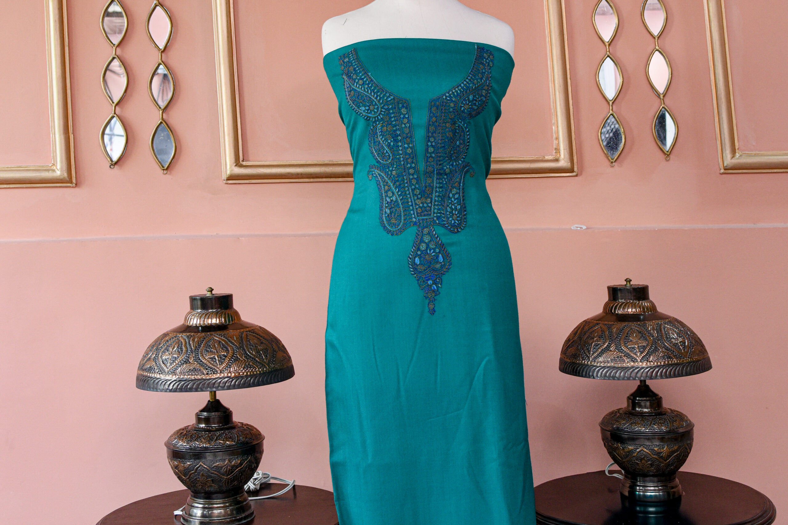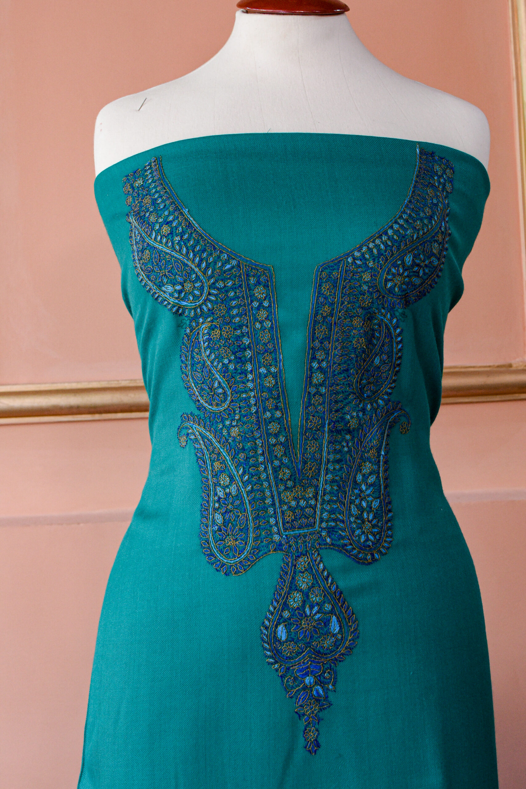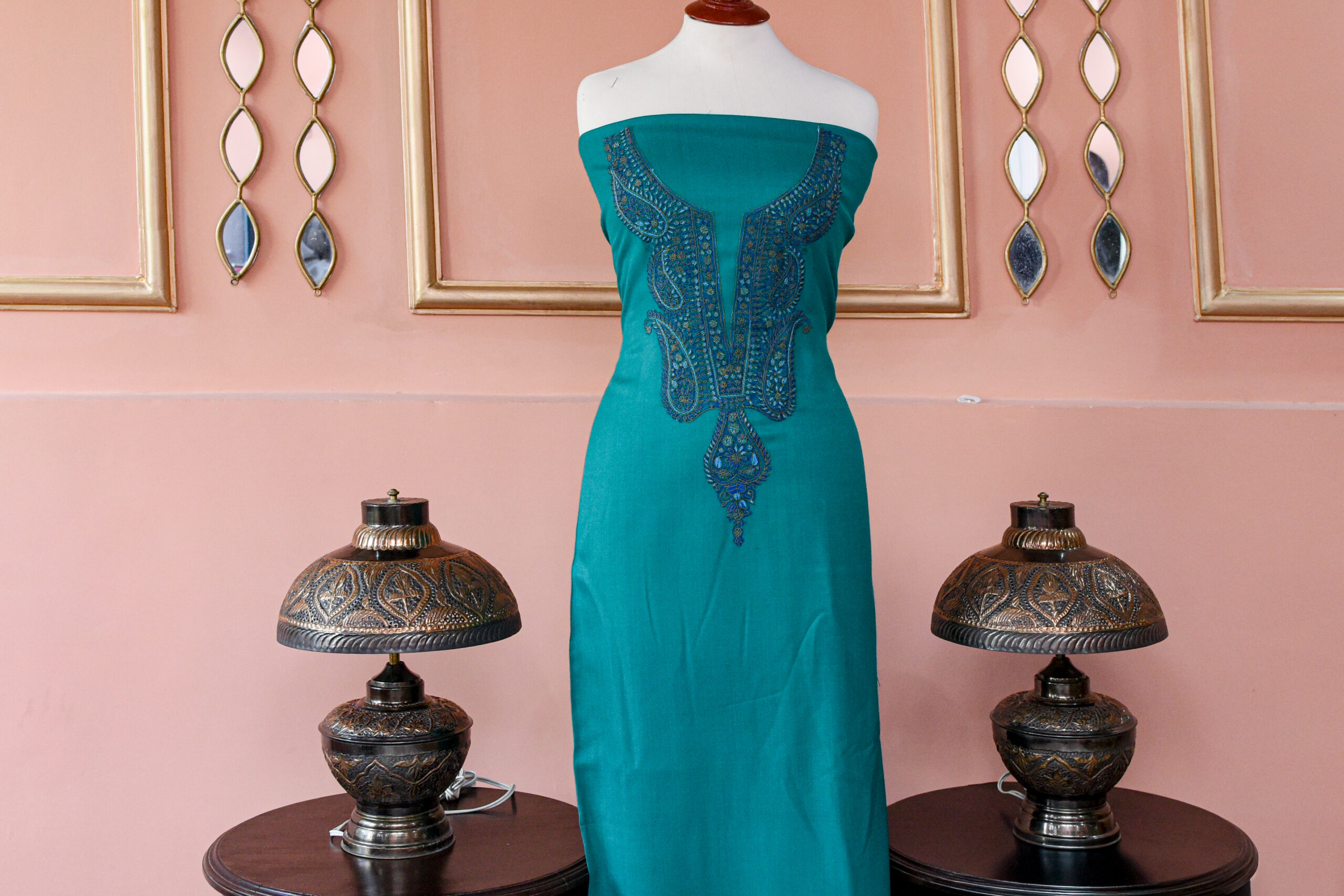 At the heart of this piece is its stunning Kashmiri Aari embroidery, meticulously worked by skilled artisans. The intricate neckline pattern features delicate threadwork in gold-toned accents, creating a refined contrast against the bold maroon base. Each stitch reflects generations of craftsmanship, making this fabric not just attire—but an heirloom of artistry.