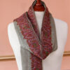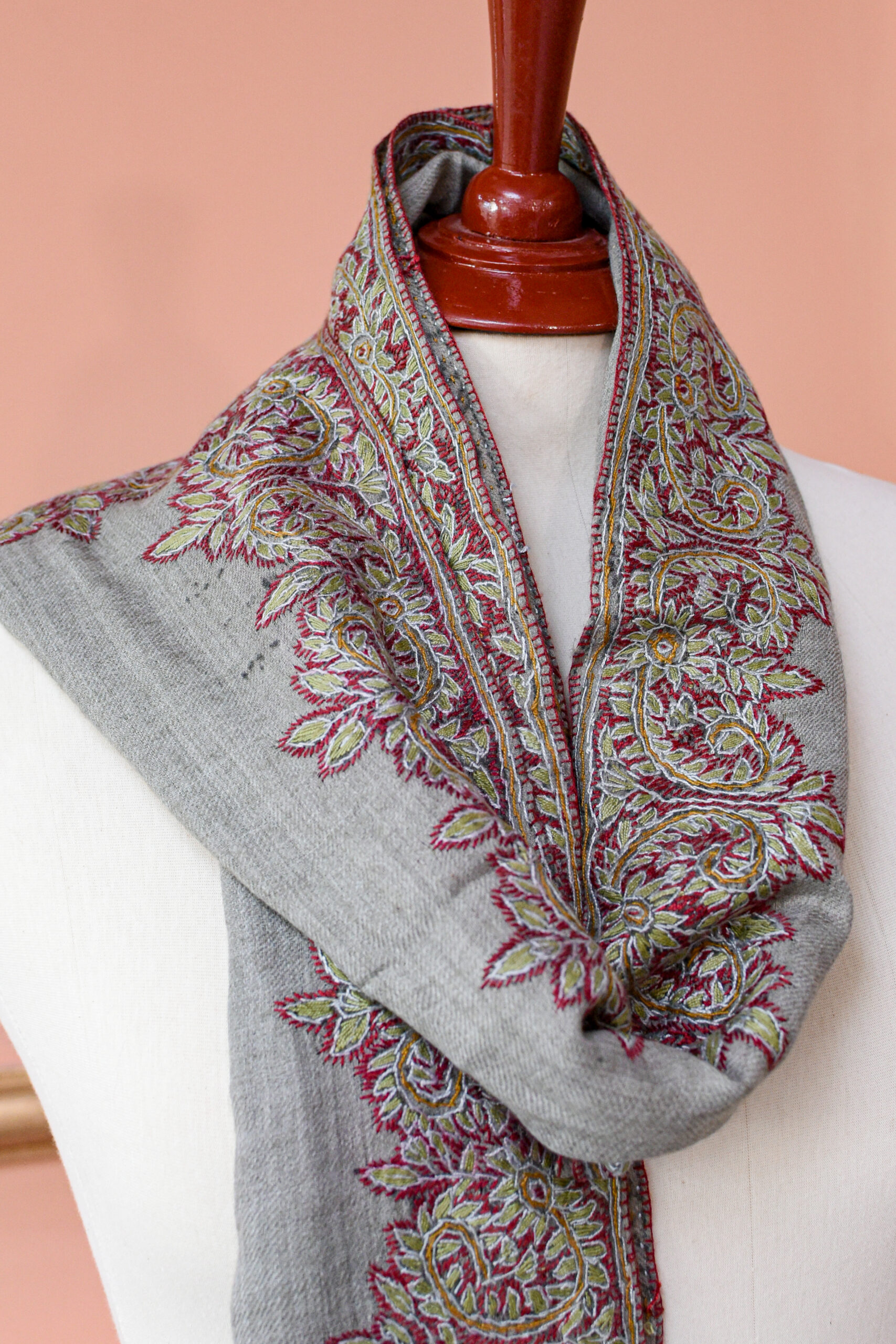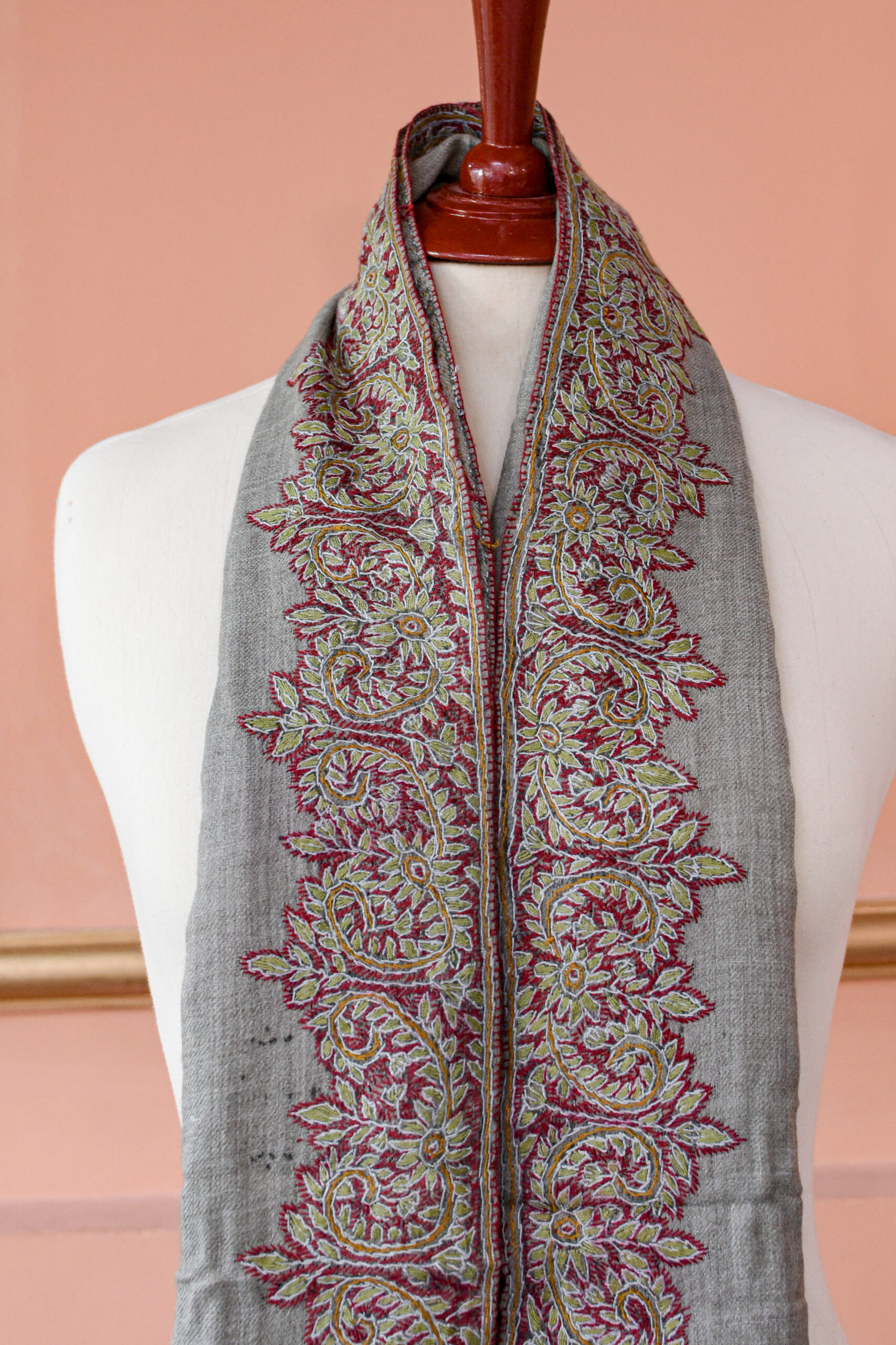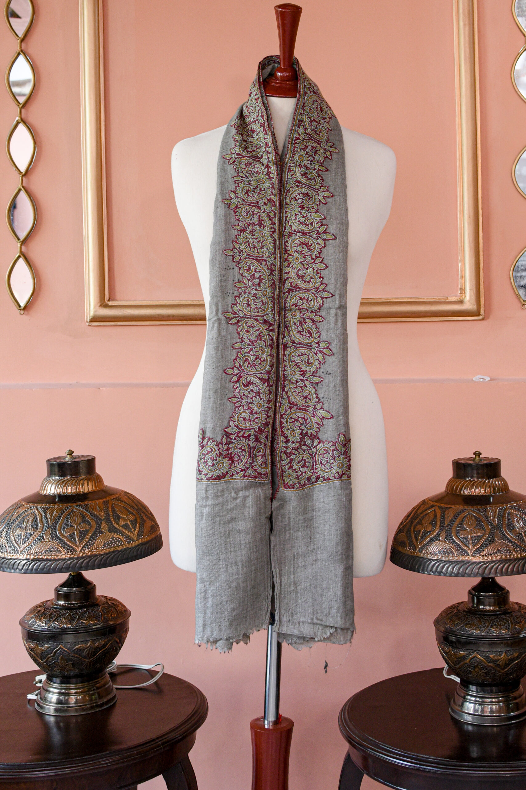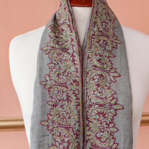 Elevate your wardrobe with this exquisite Kashmiri Aari-embroidered staller, beautifully crafted on a soft grey base. The stole features intricate floral vine motifs in shades of soft green, maroon, and ivory—each stitch showcasing the finesse of Kashmiri artisans.